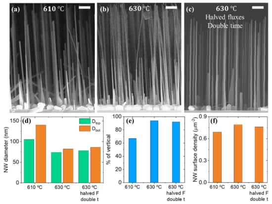 Whilst the NW surface density remains at the level of 0.6–0.9 µm−2, the fraction of vertically oriented NWs significantly increases from 70% to 90%, with the increase in the growth temperature from 610 to 630 °C, which is illustrated in Figure 2e. We assume that the high growth temperature promotes the formation of non-wetting catalytic Ga droplets with a proper contact angle, which results in the growth of vertical NWs [].