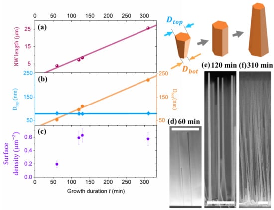 Temporal evolution of the NW mean length (a), top and bottom diameters (b) and surface density (c). SEM images show the side-view images of GaP NWs grown for 60 (d), 120 (e) and 310 min (f). The scale bars are 2 µm.