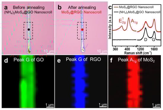 The OM images of the (NH4)2MoS4@GO nanoscroll (a) before and (b) after thermal annealing. (c) Raman spectra of the (NH4)2MoS4@GO and MoS2@RGO nanoscrolls. The Raman mapping images of (d) the (NH4)2MoS4@GO nanoscroll and (e) the RGO at peak G (1587 cm−1), and the MoS2@RGO nanoscroll at peak (f) A1g (404.2 cm−1) of MoS2.