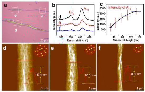 We found that the Raman peak intensity of MoS2 in the MoS2@RGO nanoscrolls varied with the height of the nanoscrolls. To investigate the relationship between the height of the MoS2@RGO nanoscroll and the amount of trapped MoS2 in it, the MoS2@RGO nanoscrolls with various heights were characterized using AFM and Raman spectroscopy, respectively. Figure 2a shows the OM image of the MoS2@RGO nanoscroll, where the boxes marked by d, e and f are three nanoscrolls with different heights. Figure 2d–f show the corresponding AFM images, and the measured heights of the three nanoscrolls are 137.4 nm, 83.5 nm and 35.4 nm, respectively. As shown in Figure 2b, the nanoscroll with a height of 137.4 nm presents a stronger Raman signal (box d), while the nanoscroll with a height of 35.4 nm has a weaker Raman signal. To further reveal the influence of the height of the MoS2@RGO nanoscrolls on the Raman peak intensity of MoS2, a lot of nanoscrolls were measured to plot the Raman peak intensity as a function of the height of the nanoscrolls. As shown in Figure 2c, with the increasing height of the MoS2@RGO nanoscrolls, the Raman peak intensity of MoS2 gradually increases, indicating that more MoS2 was trapped in a higher nanoscroll.