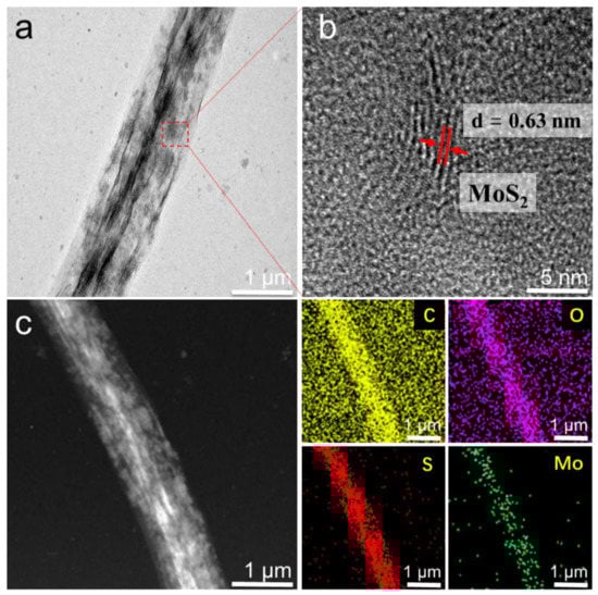 In order to clearly observe the detailed structure and confirm the formation of MoS2 in the as-prepared MoS2@RGO nanoscroll, high-resolution transmission electron microscopy (HRTEM) was used for characterization. Figure 3a shows the low-resolution TEM image of the MoS2@RGO nanoscroll. We can see that the MoS2@RGO nanoscroll exhibits a multilayer scrolled structure with a dark, dense inner layer. Figure 3b shows the HRTEM characterization result of the red dashed box shown in Figure 3a. The well resolved lattice stripes with spacing of 0.63 nm are clearly presented, which is consistent with the interlayer spacing of layered MoS2 []. Moreover, the energy dispersive X-ray (EDX) elemental mapping analysis of the MoS2@RGO nanoscroll shown in Figure 3c provides strong evidence for the homogeneous distribution of C, O, Mo and S elements in the MoS2@RGO nanoscroll. The HRTEM and EDX results confirm the uniform existence of the MoS2 nanosheet in the RGO nanoscroll.