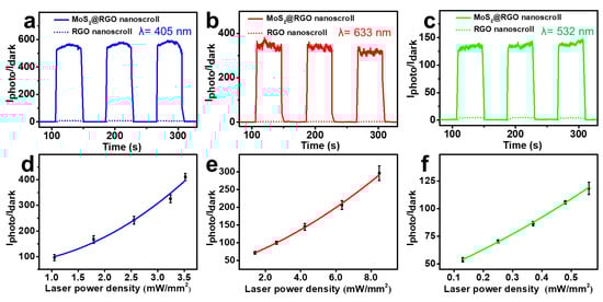 The photocurrent and dark current of the RGO nanoscrolls and MoS2@RGO nanoscrolls-based photodetectors were firstly measured under the dark and the illumination of blue, red and green lasers with different laser power densities, respectively. Because of the low light absorption of RGO, we found that the RGO-based photodetectors exhibited photosensitivity of ~7, ~2.4 and ~4 under blue, red and green lasers (Figure S5). Figure 4a–c show the PDRs of photodetectors based on RGO nanoscrolls and MoS2@RGO nanoscrolls under blue (405 nm), red (633 nm) and green (532 nm) lasers. The PDRs of photodetectors based on the MoS2@RGO nanoscrolls were 570, 360 and 140 under blue, red and green lasers, which are almost 81, 144 and 35 times those of the photodetectors based on the RGO nanoscrolls measured under the same conditions. In addition, the photocurrent of the MoS2@RGO nanoscroll is highly dependent on the power density of the incident light. As shown in Figure 4d–f, the PDRs increased as the incident laser power density increased. The different photoresponse of MoS2@RGONS to blue, green and red light could be explained as follows. In our experiment, the power intensity of green light is the lowest. However, the PDR of MoS2@RGONS is around 140 at a power density of 0.56 mW/mm2 (Figure 4f), while the PDRs of MoS2@RGONS are around 100 and 70 for blue and red lasers at power densities of 1.05 mW/mm2 and 1.41 mW/mm2 (Figure 4d,e), respectively. The MoS2 nanosheets synthesized in GONS could be multilayer, which can be confirmed by the HRTEM images shown in Figure 3b. Therefore, the multilayer MoS2 trapped into RGONS should be more suitable for detecting green lasers than blue and red lasers given that they are at the same power intensity. A similar phenomenon has also been reported in a multilayer MoS2@glassy-graphene heterostructure []. In addition, the MoS2@RGONS shows higher PDR under the blue laser than under the red laser at similar power intensities. This could be attributed the higher photon energy of the blue laser compared to the red laser, which can generate more photoinduced carriers at the same power [].