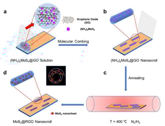 Scheme 1 shows the preparation of MoS2@RGONSs by molecular combing and thermal annealing. After the (NH4)2MoS4 was wrapped into GO nanoscrolls by molecular combing, the (NH4)2MoS4 was decomposed to MoS2 at a high temperature under the atmosphere of N2/H2 []. It was found that the (NH4)2MoS4 was decomposed to MoS3 as the temperature increased from 120 to 260 °C under an inert atmosphere. The MoS3 was further reduced to MoS2 as the temperature was higher than 230 °C under N2/H2 []. The process can be described as the following chemical reactions,