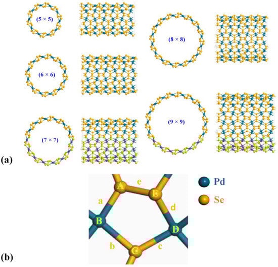 (a) Illustration of p-PdSe2 NT structures of different diameters: (5 × 5), (6 × 6), (7 × 7), (8 × 8), (9 × 9). (b) Enlarged pentagonal ring in the p-PdSe2 NT structure. The blue and yellow balls represent Pd and Se atoms, respectively. The Pd–Se bond lengths are denoted by a, b, c, and d; the Se–Se bond length is denoted by e. The bond angles are denoted by A, B, C, D, and E.