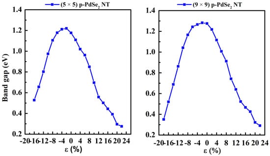The bandgap of (5 × 5) p-PdSe2 NT and (9 × 9) p-PdSe2 NT vs. strain.