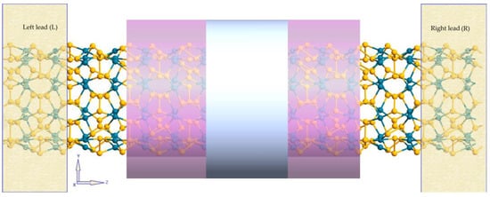 We also used ATK for the simulation of the device. The studied device model has a two-probe geometry. It consists of a left electrode, a central region, and a right electrode. The three regions have the same boundary conditions (BCs) in the two lateral directions perpendicular to the left–right electron transport direction. The left and right electrodes were assumed to have bulk properties, and the first step of the device simulation was to perform a bulk calculation of each electrode with periodic BCs in the transport direction. Then, using Bloch’s theorem, we described the wave functions in terms of transverse k-points, and to seamlessly connect the three regions, the same k-point sampling was used in the transverse directions for all three regions. A very dense k-point grid of (1 × 1 × 200) electrodes was established in the transport direction. To reduce the computational effort of DFT, the tight-binding ATK-SE tool (semi-empirical model simulation) was used in the calculation of the device [].