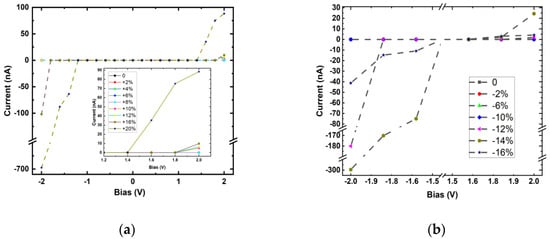 The I–V characteristics of (a) the stretched and (b) compressed (5 × 5) p-PdSe2 NTs. The inset in figure (a) is a magnified image of the applied voltage range of 1.2 V to 2.0 V.