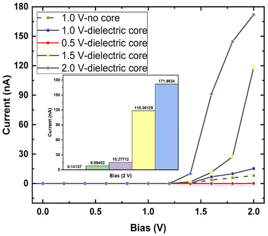 A field-effect transistor (FET) was also modeled, consisting of a source (S), a drain (D), and a gate (G) terminal (Figure 7), where the current in the semiconducting channel between the S and D terminals is modulated by the electric field generated by the voltage of the G terminal and the voltage applied between the S and D terminals [,]. The gate potentials were applied at 0.5, 1.0, 1.5, and 2.0 V. The junction between the metal G terminal and the nanotube was inserted into a dielectric layer with a dielectric constant = 4. To evaluate the ballistic transport effect, this study investigated two situations with a dielectric core and no dielectric core inside the nanotubes (Figure S5b,c). The I–V characteristics of the p-PdSe2 NTs in the field-effect situation are shown in Figure 9.