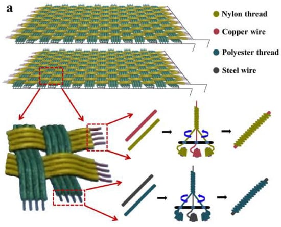 The human body is a natural alternative power source for wearable electronics. Footsteps or arm movements, for example, generate enough kinetic power to in principle drive many portable devices [5]. As textiles are used in a variety of areas, including indoor use, transport, engineering, and medicine, practical solutions for harvesting energy from textiles are highly sought. Several studies into wearable photovoltaic textiles, thermoelectric textiles, and wearable piezoelectric generators have been reported [6,7,8,9,10,11,12,13]. However, there are significant problems in matching the technology with real applications. For instance, piezoelectric generators depend on stress, whereas textiles are conformal materials such that the load-transfer strain is minimal, resulting in low power outputs.