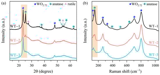 (a) XRD patterns of heterojunction samples WT-1, WT-2 and WT-3 prepared at the weight ratios of WCl6:TiO2 = 5:1, 25:1, 50:1, respectively. (b) Corresponding Raman spectra.