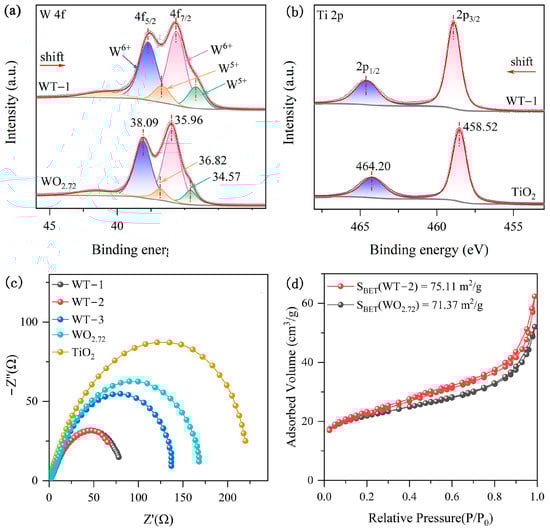 (a) W 4f XPS spectra of WO3-x/TiO2 and WO3-x. (b) Ti 2p 4f XPS spectra of WO3-x/TiO2 and TiO2. (c) Nyquist plot of WO3-x/TiO2 heterojunction samples and pure WO3-x and TiO2. (d) N2 adsorption−desorption isotherms of WO3-x/TiO2 and WO3-x.