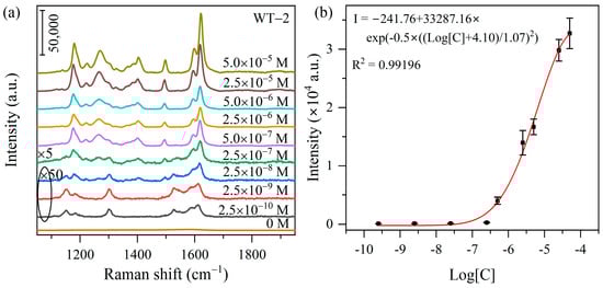 (a) SERS spectra on WT-2 heterojunction substrate when the concentration of MO solutions is varied from 5.0 × 10−5 M to 2.5 × 10−10 M and the Raman spectrum of the bare substrate (0 M). (b) GaussAmp nonlinear fitting of 1178 cm−1 peak intensity versus logarithm of MO concentration (Log[C]).