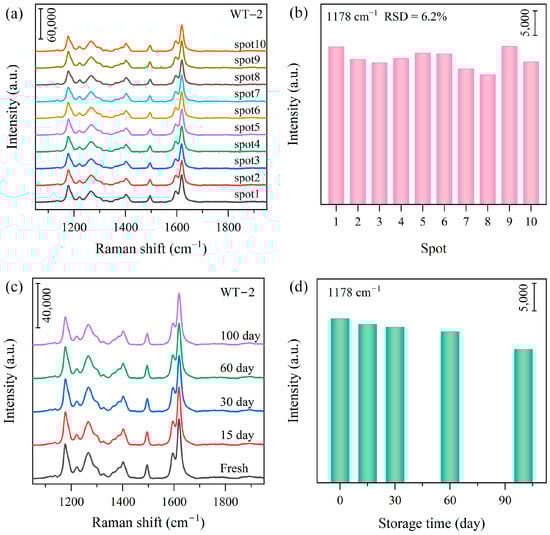 (a,b) SERS spectra of MO (2.5 × 10−5 M) collected from ten different spots on WT-2, and the corresponding 1178 cm−1 peak intensity. (c,d) SERS spectra of WT-2 subjected to storage for a different period of time, and the corresponding 1178 cm−1 peak intensity.