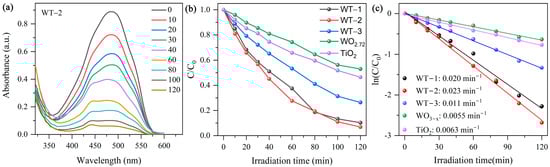 (a) UV–visible absorption spectra of MO solutions during MO degradation over WT-2. (b) Photodegradation efficiency (Ct/C0) of WO3-x/TiO2 heterojunction nanocomposites together with pure WO3-x and TiO2. (c) Fitting of ln(Ct/C0) versus time and the estimated kinetic constant.