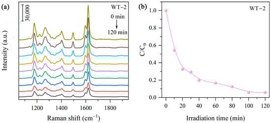 (a) SERS spectra of MO solutions withdrawn at given time intervals during MO degradation over WT-2. (b) Photodegradation efficiency estimated based on SERS measurement.