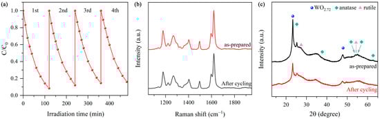 As shown in Figure 9a, the photocatalytic activity of WT-2 remains 90% that of the freshly prepared sample after four consecutive runs. Notably, the SERS signal intensity of WT-2 after the cycling experiments remains 87% that of the freshly prepared sample (Figure 9b). Compared to the freshly prepared sample, there is no pronounced change in the XRD pattern of WT-2 collected after four consecutive runs (Figure 9b). These results demonstrate that WO3-x/TiO2 heterojunction samples have excellent stability and are suitable for re-utilization.