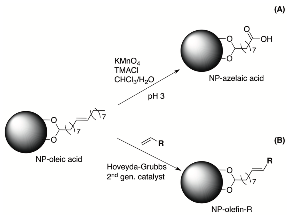 Direct chemical modification of the surfactant for oleic acid-coated IONPs, by (A) oxidation of the double bond and (B) olefin metathesis by the use of Hoveyda-Grubbs 2nd generation catalyst.