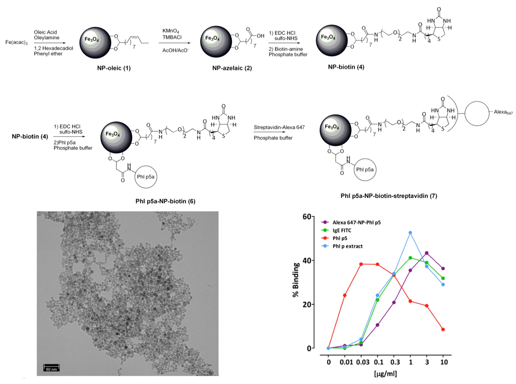 Synthesis of multifunctional IONPs by the direct chemical modification of oleic acid. The attachment of allergen Phl p5a and a fluorophore, via biotin-streptavidin interaction, was done by amide formation with the carboxylic groups generated. TEM image of the final IONPs (bottom left). Immunogenicity of the synthesized nanoparticles compared to non-functionalized particles, grass pollen extract and pure protein (bottom right). Reproduced from []. Copyright 2012, John Wiley & Sons, Ltd.