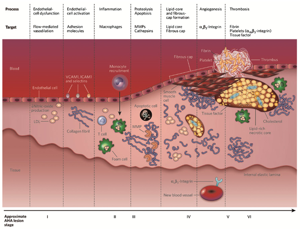 One of the main issues of an atherosclerotic lesion is that it develops slowly over decades, being finally identified at advanced states of the pathology []. One of the main goals in the utilization of molecular imaging in atherosclerosis is the possibility of early diagnosis, at a subclinical point [,].
