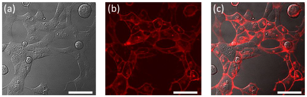 (a) Bright field image, (b) fluorescence image, and (c) merge of human embryonic kidney 293 (HEK293) cells after staining with ampicillin-modified tetramethylrhodamine (TMR). Scale bar shows 50 µm.