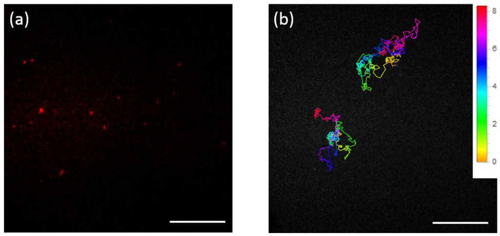 (a) Fluorescence image of the surface of a single cell treated with FND-HPG-Amp particles. Bright red spots indicate the fluorescence from FNDs; (b) Molecule trajectories of two FND-labeled IL-18Rα recorded for ca. 8 s. The color code of the trajectory shows the time course, as indicated on the right side. Scale bar shows 10 μm. Movies are provided in supplementary material.