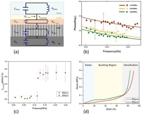 (a) Simplified heat transfer mechanism within the sample illustrated in thermal circuit; (b) Experimentally measured phase responses (various points) of various contact force along with their best-fit solutions (solid lines) versus excitation frequency; (c) Cu-CNT arrays contact thermal conductance versus contact pressure; (d) Experimental uniaxial stress–strain responses of vertically aligned CNT Arrays.