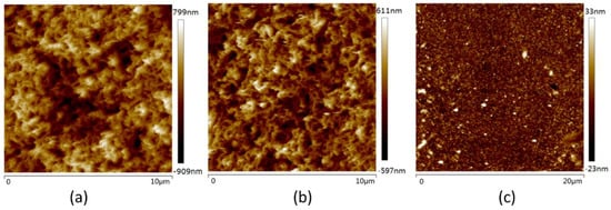 (a) The atomic force microscopy (AFM) topography profile of upper surface of CNT arrays before loading. The Ra roughness is 197 nm; (b) The AFM topography profile of upper surface of CNT arrays after loading. The Ra roughness is 136 nm; (c) The AFM topography profile of copper. The Ra roughness is 5.67 nm.