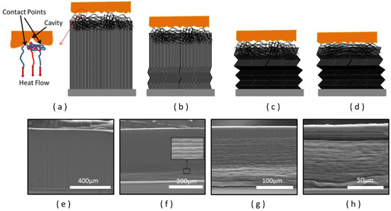 The slowly increased thermal contact at the initial stage distinguishes CNT/Cu interfaces from general dry contact surfaces as they usually experience immediate increase with contact force. The behavior is due to the unique mechanical response of CNT arrays under pressure. Figure 3d shows the stress (the applied force divided by the array’s area) versus strain (the compressed distance relative to the array’s thickness) curves for the CNT arrays under compression. The compression process is generally including an initial elastic region, a buckling region marked by a plateau and a final densification, which is consistent with previous research []. SEM images (Figure 5e–h) illustrate that CNT arrays form sequential buckling-like folds, which emanates from the bottom and propagates toward the top. The average buckling wavelength is around 2 μm. Previous study has revealed that the sequence of bottom-to-top buckling was driven by the relative local density []. As can be evaluated from the level of the stresses, the slowly increasing stage shown in Figure 3c corresponds to the buckling region in Figure 3d. As can be seen, the pressure mainly contributes to the buckling rather than the deformation of the top surface of CNT arrays at this stage as illustrated in Figure 5a,b and therefore, does not improve the thermal contact at interface significantly.