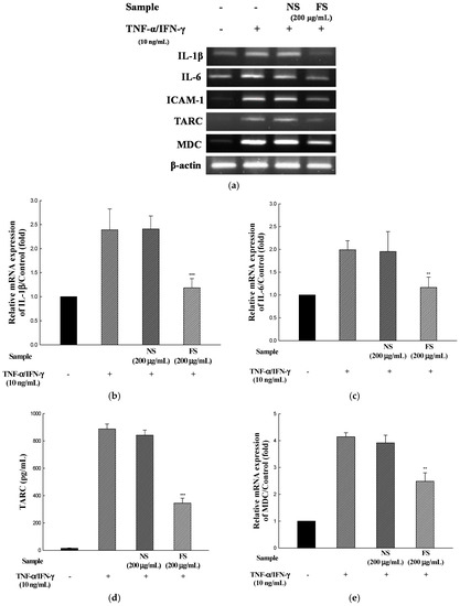 HaCaT cells (1 × 106 cells/well) were treated with TNF-α/IFN-γ or with medium alone in the presence or absence of NS or FS for 24 h. The total RNA was extracted using the Trizol reagent (Invitrogen, Carlsbad, CA, USA) according to the manufacturer’s instructions. For cDNA synthesis, 1 µg of total RNA was mixed with oligo dT primers using Maxime RT premix (iNtRON Biotechnology, Sungnam, Korea) and water to a total volume of 20 µL and incubated. The PCR amplification conditions were as follows: IL-1β, 95 °C, 30 s, 54 °C, 30 s, 72 °C, 60 s for a total of 35 cycles; IL-6, 95 °C, 30 s, 57 °C, 30 s, 72 °C, 60 s for a total of 35 cycles; ICAM-1, 95 °C, 30 s, 57 °C, 30 s, 72 °C, 60 s for a total of 35 cycles; TARC, 95 °C, 30 s, 54 °C, 30 s, 72 °C, 60 s for a total of 35 cycles; MDC, 95 °C, 30 s, 65 °C, 30 s, 72 °C, 60 s for a total of 35 cycles; β-actin, 95 °C, 30 s, 60 °C, 30 s, 72 °C, 60 s for a total of 35 cycles. The primer sequences are shown in Table 1.