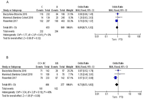 For the BsmI polymorphism, we pooled our results with those reported by Baczyńska-Strzecha et al. and Rosenfeld et al. [9,34]. The Q-test and I2 statistics showed no significant heterogeneity across studies under the allelic (p = 0.31; I2 = 15%), dominant (p = 0.18; I2 = 42%) and recessive (p = 0.97; I2 = 0%) models. Using the fixed effect model, the meta-analysis showed a significant negative association with PTB under the allelic (A vs. G: OR = 0.74, 95%CI 0.59–0.93) and recessive (AA vs. GG + AG: OR = 0.62, 95%CI 0.43–0.89) models. By contrast, no statistically significant association was evident under the dominant model (AA + AG vs. GG: OR = 0.78, 95%CI 0.54–1.12) (Figure 4).