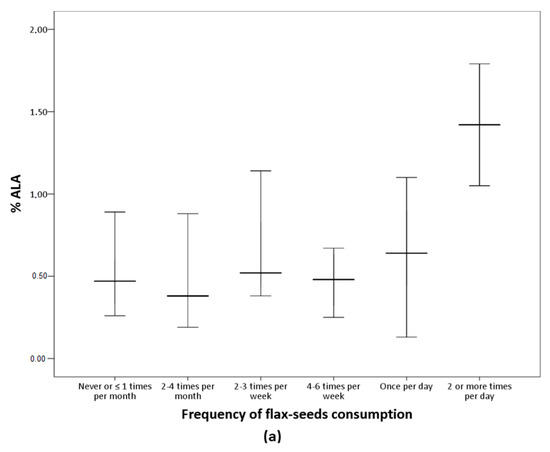 As the group with n-6/n-3 < 10 included consumers and non-consumers of n-3 supplements, the influence of any specific food item intake on serum long-chain n-3 fatty acids was evaluated. We observed similar consumption patterns of nuts and oils in the three n-6/n-3 groups while among the seeds, results suggest an improvement of the n-6/n-3 ratio associated with higher frequency of consumption of flax-seeds. In fact, these seeds are rich in ALA, and consistently, results showed higher serum ALA concentration with higher intake of flax-seeds (Figure 1). However, there was no rise in serum DHA as flax-seed intake increased. This is according to studies reporting that the intake of ALA-rich foods is insufficient to increase serum DHA [23,26,27]. Moreover, this coincides with the results discussed above regarding n-3 supplementation effects on DHA. Altogether, results suggested that the n-3 supplementation increased EPA but not DHA, and the intake of specific foods was insufficient to increase DHA serum levels.
