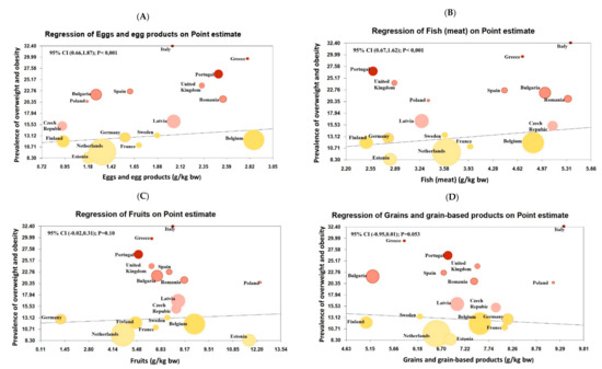 Meta-regression analyses. Plots show the point estimates of the prevalence of overweight/obesity of different countries in Europe during the period (2006–2016) according to different food groups provided by the food consumption data from the European Food Safety Authority (EFSA) (mean quantity in g/kg of body weight). Abbreviations: bw: body weight; g/kg: grams per kilogram; CI: confidence intervals.