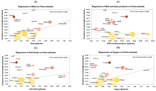 Meta-regression models (Figure 4) showed a positive significant association between the pooled prevalence estimate of overweight/obesity with consumption from the following food groups: (A) eggs and egg products (coefficient: 1.2; 95% CI: 0.6–1.8), (B) fish (meat) (coefficient: 1.1; 95% CI: 0.6–1.6), (E) meat (coefficient: 2.2; 95% CI: 2.4–5.4), (G) soft drinks (coefficient 0.7; 95% CI: 0.5–1.0), (H) added sugars (coefficient: 8.45; 95% CI: 6.4–10.4), and (I) vegetables and vegetable products (coefficient: 1.8; 95% CI: 1.4–2.1). Otherwise, negative associations were found with (F) milk and dairy products (coefficient: −0.07; 95% CI: −0.1, −0.02). No significant differences were found with (C) fruits (coefficient: 0.14; 95% CI: −0.02, 0.3) and (D) grains and grain-based products (coefficient: −0.47; 95% CI: −0.9, 0.007). All food groups are described as mean quantity in grams per kilogram (g/kg) of body weight for each European country.