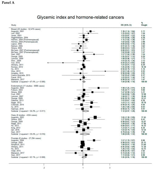Study-specific and summary relative risks (RRs) of hormone-related cancers for the highest versus the lowest category of glycemic index (Panel A) or glycemic load intake (Panel B).