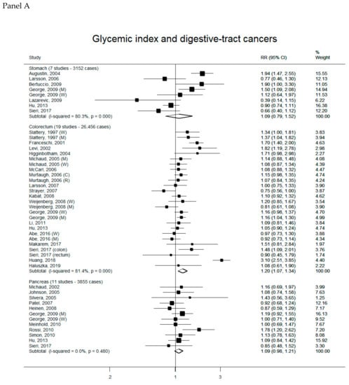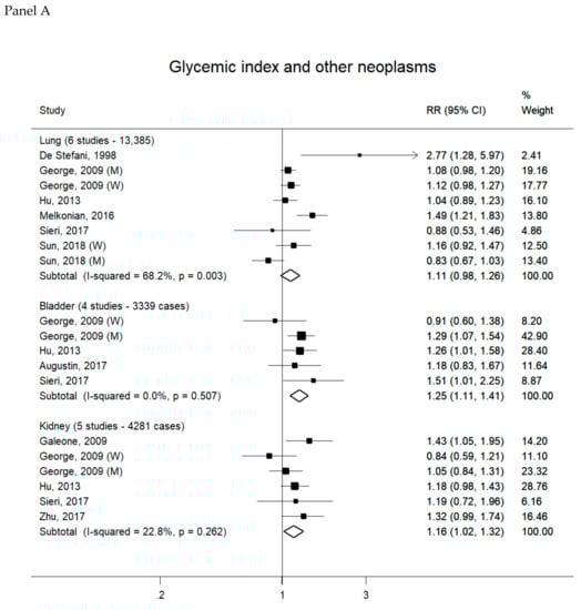 Given the new original data, we updated our systematic review and meta-analysis [] to derive a more precise estimation of the associations. Specifically, we reviewed the most recent (up to May 2019) epidemiological data on the association between dietary GI and GL and cancer risk, updated summary RRs for stomach, colorectal, pancreatic, breast, endometrial, ovarian and prostate cancers and addressed issues of heterogeneity and complexities of interpretation []. Moreover, we calculated meta-analytic estimates for kidney, and for the first time, lung and bladder neoplasms.