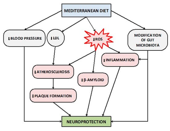 To date, the pathways underlying the proposed neuroprotective effects of the MedDi are not fully understood. There are several possible mechanisms that could explain the effect of the nutritional pattern of MedDi on cognitive health. Neurodegenerative diseases such as AD are displayed with typical features of cognitive dysfunction, which may be partially corrected by adhering to a balanced nutritional pattern. Besides the histopathological hallmarks (e.g., Aβ accumulation, Tau hyper-phosphorylation), the neuronal loss seen in AD has been additionally associated with other mechanisms as reduced blood flow (due to the atherosclerotic process), mitochondrial dysfunction, oxidative stress, neuroinflammation, and alteration of the gut microbiota [].
