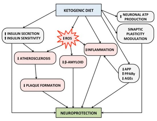 - Pinto, A.; Bonucci, A.; Maggi, E.; Corsi, M.; Businaro, R. Anti-Oxidant and Anti-Inflammatory Activity of Ketogenic Diet: New Perspectives for Neuroprotection in Alzheimer’s Disease. Antioxidants 2018, 7, 63. [Google Scholar] [CrossRef] [PubMed]