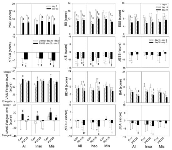 Effect of PS128 and placebo treatment on sleep/mood-related scores after 4 weeks of treatment. Within-groups analysis: both groups showed significant decreases in PSQI, ISI, ESS, BDI-II, and BAI scores compared to baseline. There was a significant decrease between groups in BDI-II and VAS fatigue level before sleep. † p < 0.05, ‡ p < 0.01 vs. baseline using repeat measurement ANOVA. * p < 0.05 vs. the control group by generalized estimating equations. Values are presented as mean ± SEM. All: Con, n = 19, PS128, n = 21; Inso: Con, n = 9, PS128, n = 12; Mis: Con, n = 10, PS128, n = 9. Con, control; Inso, insomniac; Mis, misperception; BMI, body mass index; PSQI, Pittsburgh Sleep Quality Index; ISI, Insomnia Severity Index; ESS, Epworth Sleepiness Scale; BDI-II, Beck Depression Inventory-II; BAI, Beck Anxiety Inventory; VAS, Visual Analogue Scale; WASO, wake after sleep onset; SE, sleep efficiency.