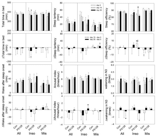 Effects of PS128 on sleep EEG. On day 30, the PS128 group showed significant decreases in awakenings in N3 compared to the control group. † p < 0.05, ‡ p < 0.01 vs. baseline by repeat measurement ANOVA. * p < 0.05 vs. the control group by generalized estimating equations. Values are presented as mean ± SEM. All: Con, n = 19, PS128, n = 21; Inso: Con, n = 9, PS128, n = 12; Mis: Con, n = 10, PS128, n = 9. Con, control; Inso, insomniac; Mis, misperception; N3, non-rapid eye movement sleep stage 3.