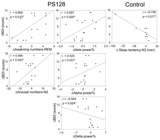 When determining correlations involving BDI-II scores, we calculated the difference (△) in scores as the score on day 0 minus the score on day 30. The BDI-II score was improved if it was greater than zero (△BDI-II > 0). △BDI-II in the PS128 group was positively correlated with the △awakening numbers-REM, △arousal numbers-N2, △beta power %, and △alpha power %. BDI scores in the PS128 group were negatively correlated with △delta power%. In the control group, △BDI-II scores were only negatively correlated with △sleep latency-N3 (Figure 6).