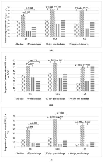 For mGPS, the proportion of patients with poor prognosis score 1 or 2 was significantly higher in Group SS-E (54% to 83%, p = 0.039) and Group DS (25% to 70%, p = 0.012) between baseline and upon discharge. The proportions of patients with mGPS score 1 or 2 were significantly lower in all groups at 30-days post-discharge as compared with upon discharge. At 90 days post-discharge, the proportion of patients with mGPS score 1 or 2 was significantly lower than upon discharge only in Group SS (74% to 30%, p = 0.006).
