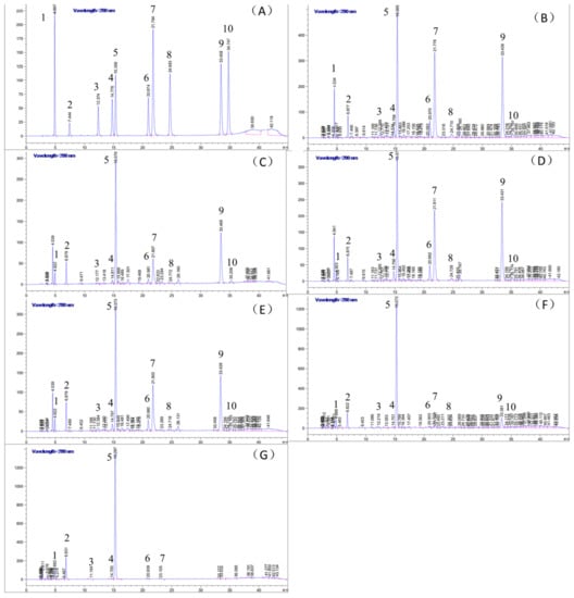 The HPLC chromatograms of the (A) standard compounds, (B) green tea, (C)white tea, (D) yellow tea, (E) oolong tea, (F) black tea and (G) dark teaunder 280 nm. 1, gallic acid; 2, gallocatechin; 3, epigallocatechin; 4, catechin; 5, caffeine; 6, epicatechin; 7, epigallocatechingallate; 8, gallocatechingallate; 9, epicatechingallate; 10, catechingallate.The samples were detected at 280 nm.