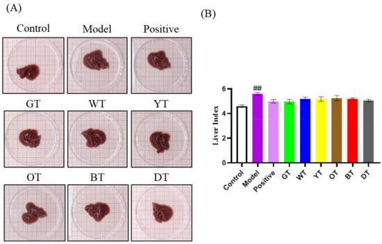 The liver (A) and liver index (B) of C57/BL mice treated with CCl4. D Data are expressed as mean ± SEM of at least three independent experiments (n ≥ 5). ## p < 0.01 Control versus Model group.