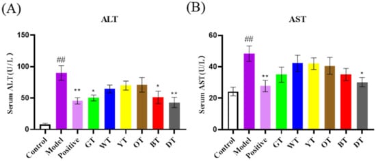 As shown in Figure 2A, CCl4 exposure significantly enlarged the liver compared to that of the untreated control mice, which was marginally decreased by the different tea extracts. The liver index was also markedly higher in the model group compared to the control group (p < 0.01). The mice treated with the tea extracts showed a decrease in the liver index, although the difference was not significant (Figure 2B). Consistent with the gross observations, the serum ALT and AST levels were markedly elevated after CCl4 exposure, which was indicative of liver injury and dysfunction. Black tea and dark tea significantly decreased the ALT levels (p < 0.01; Figure 3A), and all the tea extracts, except those of oolong tea, significantly reduced the serum AST levels (p < 0.01; Figure 3B).