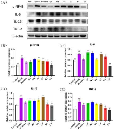 Fermented tea inhibited CCl4-induced inflammation by blocking the NF-κB signaling pathway. (A) Immunoblot showing expression levels of TNF-α, IL-1β, IL-6, and p-NF-κB and the quantification of (B) p-NF-κB, (C) IL-6, (D) IL-1β, and (E) TNF-α. β-actin was the loading control. Data are expressed as mean ± SEM of at least three independent experiments (n ≥ 5). # p < 0.05 and ## p < 0.01 versus control group; * p < 0.05 and ** p < 0.01 Tea-treated versus the Model group.