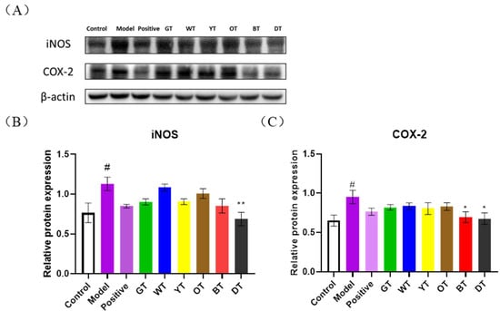 (A) Immunoblot showing expression levels of iNOS and COX-2 proteins in the indicated groups and the quantification of (B) iNOS and (C) COX-2. β-actin was the loading control. Data are expressed as mean ± SEM of at least three independent experiments (n ≥ 5). # p < 0.05 versus control group; * p < 0.05 and ** p < 0.01 Tea-treated versus the Model group.