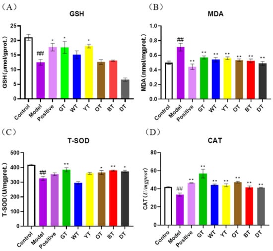 Levels of GSH (A), MDA (B), SOD (C), and CAT (D) in mice liver. Data are expressed as mean ± SEM of at least three independent experiments (n ≥ 5). ## p < 0.01 versus control group; * p < 0.05 and ** p < 0.01 Tea-treated versus the Model group.