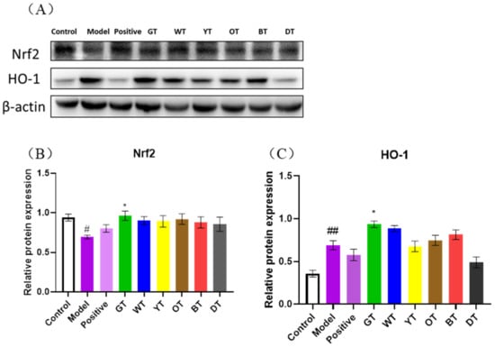 Liver tissue samples (100 mg) were homogenized in 990µL radio immunoprecipitation assay (RIPA) supplemented with 10 µL phenylmethanesulfonyl fluoride (PMSF). The homogenates were centrifuged at 18,506× g (20 min, 4 °C) to remove debris and were kept on ice for 60 min. The protein content in the lysates was measured using bicinchoninic acid (BCA, Thermo, Waltham, MA, USA, VK312556). Equal amounts of protein per sample were mixed with a quarter volume of 4× loading buffer and denatured by incubating at 98 °C in a water bath for 5 min. The proteins were separated by polyacrylamide gel electrophoresis (80–120 V) and transferred onto a polyvinylidene fluoride (PVDF) membrane. After blocking, the membranes were incubated overnight with primary antibodies (all diluted 1:1000) specific for cyclooxygenase 2 (COX-2, CST, Danvers, MA, USA, 12282S), inducible nitric oxide synthase (iNOS, SantaCruz, Dallas, TX, USA, SC-651), p-NF-κB p65 (CST, Danvers, MA, USA, 13346S), IL-1β (Bioss, MA, USA, bs-0812R), IL-6 (SantaCruz, Dallas, TX, USA, SC-1265), TNF-α (Abcam, Cambridge, UK, ab6671), HO-1 (CST, Danvers, MA, USA, 43966S), Nrf2 (CST, Danvers, MA, USA, 12721S), and β-actin (Sigma, MO, USA, A1978) at 4 °C, followed by the secondary antibody at 37 °C for 50 min. After colorimetric detection and chemiluminescence imaging, the positive bands were quantified by densitometry using Image J software. The results were normalized to the density of β-actin bands.