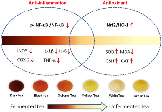 Tea is one of the three most routinely consumed non-alcoholic beverages worldwide and has proven health benefits. In this study, we found that the extracts of different types of tea obtained from the same cultivar mitigated CCl4-induced liver injury and dysfunction in a mouse model. Mechanistically, dark tea had a significant anti-inflammatory effect, whereas green tea alleviated the oxidative stress in the liver tissues. The content of tea polyphenols gradually decreases with the degreeof fermentation. Given that tea polyphenols are potent antioxidants and free radical scavengers, this could explain the stronger antioxidant effect of green teaas opposed to the anti-inflammatory effect of dark tea.