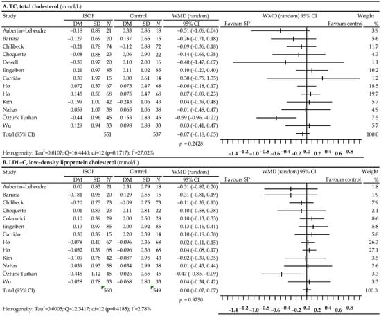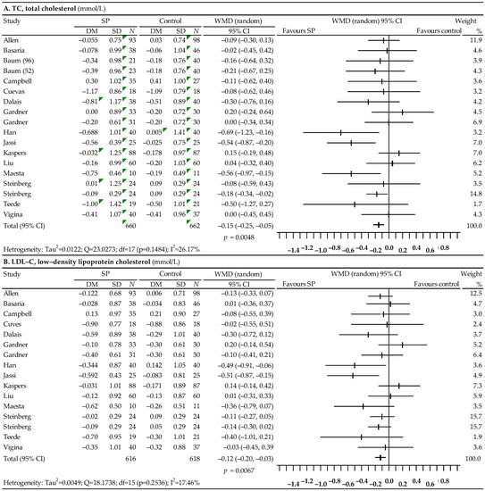 Our meta-analysis of the effect of soy protein on the lipid profile showed a significant decrease in TC levels: WMD = −0.15; 95% CI: −0.25–0.05; p = 0.0048, LDL-C levels: WMD = −0.15; 95% CI: −0.25–0.05; p = 0.0067, as well as a significant increase in HDL-C levels: WMD = 0.05; 95% from CI: 0.02 to 0.08; p = 0.0034. There was also a slight reduction in TG levels, which, however, was statistically non-significant (WMD = −0.08; 95% CI: from −0.19 to 0.03; p = 0.1462). The meta-analysis by Moradi et al. supports the hypercholesterolemic effect of soy lowering the serum TC levels. Soy consumption was associated with a significant decrease in TG: −5.04 mg/dL; 95% CI: −9.95, −0.13; p = 0.044), TC (MD: −3.02 mg/dL; 95% CI: −5.56, −0.47; p= 0.02), LDL-C (3.27 mg/dL; 95% CI: −6.01, −0.53; p = 0.019) and HDL-C (MD: −2.28 mg/dL; 95% CI: −4.27, −0.29; p = 0.025). The reductions in LDL-C, TG, and HDL-C were larger in subjects consuming isolated soy protein than taking-in isolated soy isoflavones [37]. The results of previous meta-analyses also revealed a significant decrease in serum TC, LDL-C, and TG concentrations after the consumption of soy protein containing isoflavones [103].